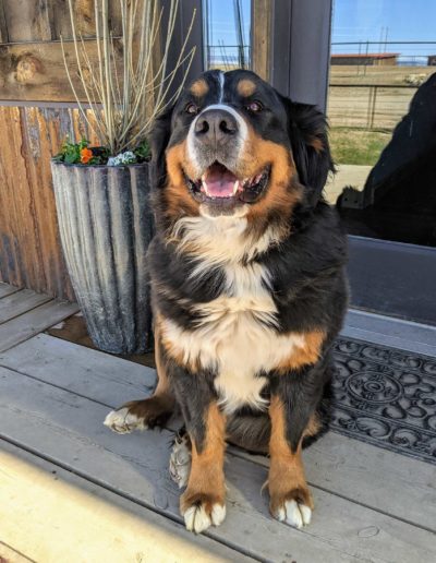 Our lovely Gidget is our AKC registered Bernese Mountain Dog. She is 25" at the shoulder and weighs 95 pounds. She is health tested through Embark and OFA are normal/good for hips, elbows and cardiac.